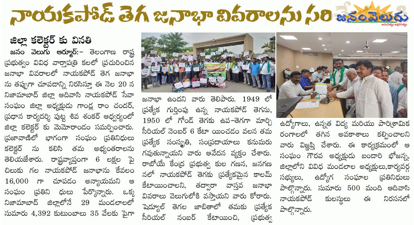 జనం వెలుగు ఆర్మూర్:- తెలంగాణ రాష్ట్ర ప్రభుత్వం వివిధ వార్తాపత్రి కలలో ప్రచురించిన జనాభా వివరాలలో నాయకపోడ్ తెగ జనాభాను తప్పుగా చూపడాన్ని నిరసిస్తూ ఈ నెల 20 న నిజామాబాద్ జిల్లా ఆదివాసి నాయకపోడ్ సేవా సం ఘం జిల్లా అధ్యక్షుడు గాండ్ల రాం చందర్, ప్రధాన కార్యదర్శి పుట్ట శివ శంకర్ ఆధ్వర్యంలో జిల్లా కలెక్టర్ కు మెమోరాండం సమర్పించారు. ప్రజావాణిలో భాగంగా సంఘం ప్రతినిధులు కలెక్టర్ ను కలిసి తమ అభ్యంతరాలను తెలియజేశారు. ​రాష్ట్రవ్యాప్తంగా 6 లక్షలపై చిలుకు గల నాయకపోడ్ జనాభాను కేవలం 16,000 గా చూపడం అన్యాయమని ఆ సంఘం ప్రతినిధులు పేర్కొన్నారు.