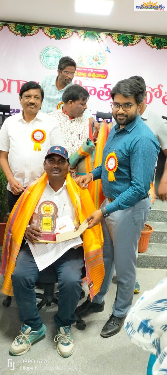 జనం వెలుగు, బాసర:- నిర్మల్ జిల్లా బాసర మండల పరిధిలోని ఓని గ్రామానికి చెందిన, అబ్బువార్ గౌతం కు కవి సమ్మేళనం లో అవార్డు లభించింది. ఈ సందర్భంగా, తెలంగాణ రాష్ట్ర ఆవిర్భావ దినోత్సవం లో భాగంగా దశాబ్ది ఉత్సవాలు నిర్మల్ పట్టణంలోని నూతన కలెక్టరేట్ భవనంలో కవి సమ్మేళనంలో ఈ కార్యక్రమంలో జిల్లా నుండి ఉర్దూ తెలుగు భాషల్లో కవి సమ్మేళనం సాహిత్య కార్యక్రమాన్ని నిర్వహించగా దాదాపు 90 మంది పైచిలుకు కళాకారులు పాల్గొనగా వాటిలో బాసర నుండి ఏకైక కళాకారుడు కవి గాయకులు అబ్బువార్ గౌతం బుక్కెడు బువ్వ కోసం అనే శీర్షిక నాపై తమ కవిత్వాన్ని వినిపించగా పాల్గొన్న కవులు కవయిత్రులు ఆస్వాదించి ఆనందంపజేసి అభినందించారు అనంతరం జిల్లా కలెక్టర్ వరుణ్ రెడ్డి చేతుల మీదుగా మెమొంటో సర్టిఫికెట్ శాలువా కప్పి సత్కరించారు ఈ కార్యక్రమంలో రాష్ట్ర దేవాదాయ ధర్మాదాయ అటవీ న్యాయ గృహ నిర్మాణ శాఖ మంత్రి అల్లోల్ల ఇంద్రకరణ్ రెడ్డి,, జిల్లా కలెక్టర్ వరుణ్ రెడ్డి జిల్లా విద్యాశాఖ అధికారి రవీందర్ ప్రముఖ పిల్లల వైద్య అధికారి కవులు అప్పల చక్రధర్ కృష్ణంరాజు సీనియర్ కవులు మునుమడుగుల రాజారావు వెంకట్ పోతన రామ్ రెడ్డి కడారి దశరథ్ పాల్గొన్నారు.