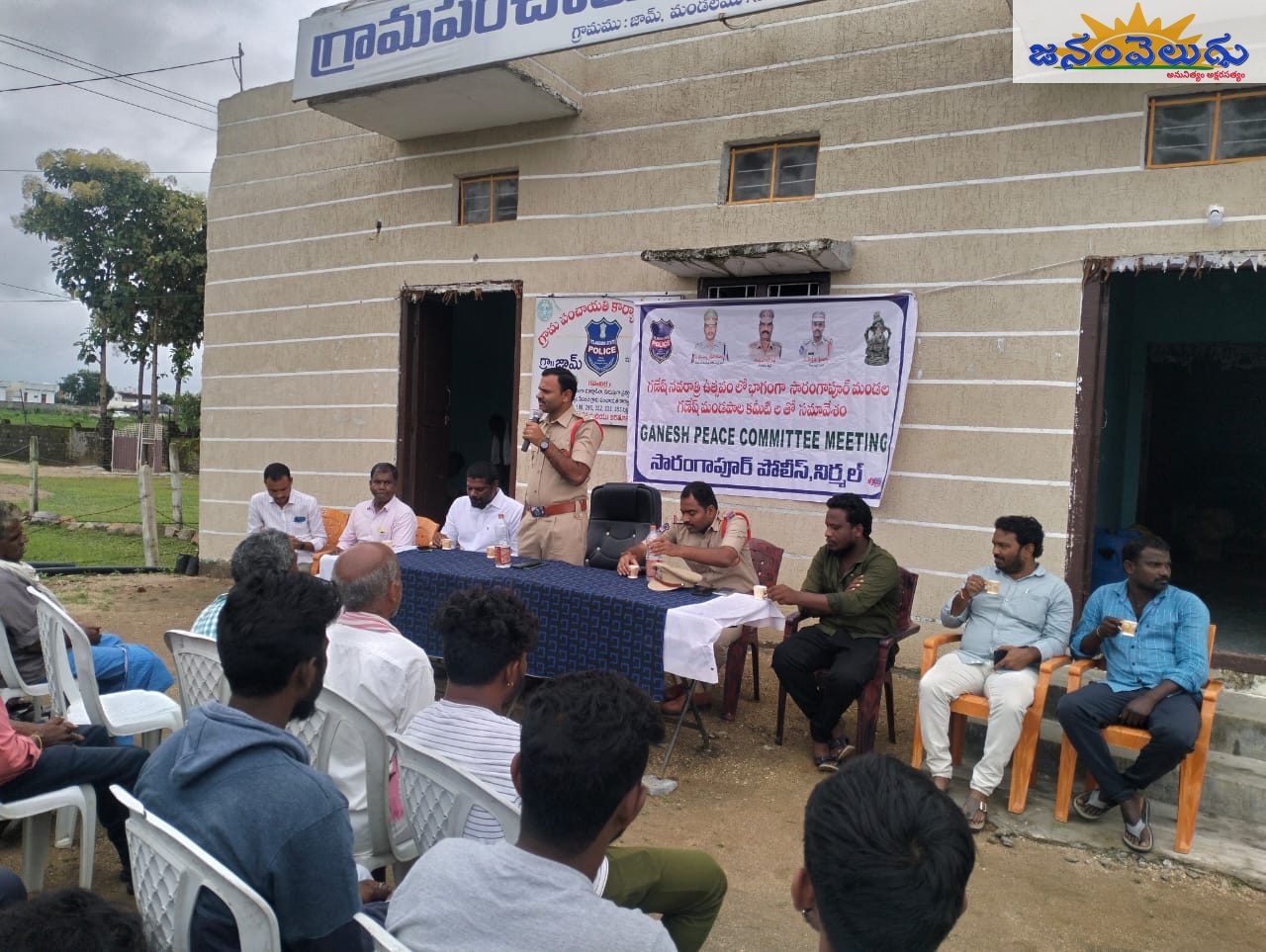 జనం వెలుగు, సారంగాపూర్:- సారంగాపూర్ మండలంలోని జామ్ గ్రామంలో రూరల్ సీఐ శ్రీనివాస్ ఎస్సై కృష్ణ సాగర్ రెడ్డి లు శుక్రవారం గణేష్ మండపాల నిర్వాహకులతో సమావేశం నిర్వహించారు. ఈ సందర్భంగా రూరల్ సీఐ శ్రీనివాస్ మాట్లాడుతూ నిమజ్జన దినోత్సవాన్ని అందరూ కలిసి ఐక్యమత్యంగా జరుపుకోవాలని, అవాంఛనీయ సంఘటనలు జరగకుండా ప్రతి పోలీసులకు సహకరించాలని, నిమజ్జనం రోజు గణేష్ మండపాల నిర్వహకులు డీజే అనుమతి తీసుకోవాలని గ్రామంలో అన్ని చెరువులు నీటితో సమావేశం నిర్వహించారు. ఈ నిండుగా ఉన్నాయి కాబట్టి జాగ్రత్త ఉండాలని అన్నారు. సమావేశంలో పోలీస్ సిబ్బంది, మండపాల నిర్వహకులు, నాయకులు, గ్రామస్తులు పాల్గొన్నారు.