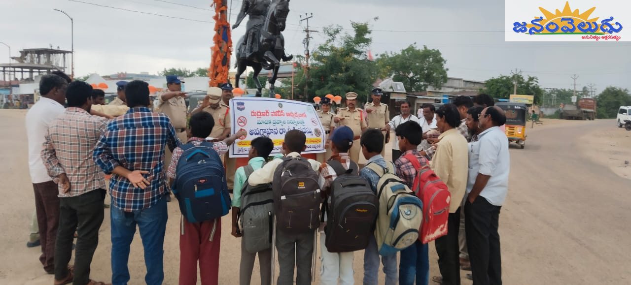 జనంవెలుగు, రుద్రూర్:- రుద్రూర్ మండల కేంద్రంలోని బస్టాండ్ ప్రాంగణం, జిల్లా పరిషత్ బాలుర ఉన్నత పాఠశాలలో మాదకద్రవ్యాల నిర్మూలనకై పోలీస్ శాఖ ఆధ్వర్యంలో గురువారం అవగాహన ర్యాలీ, సదస్సు, ప్రతిజ్ఞ నిర్వహించారు. ఈ సందర్భంగా ఎస్సై సాయన్న మాట్లాడుతూ యువత చెడు వ్యసనాలకు దూరంగా ఉండాలన్నారు. మాదక ద్రవ్యాల వినియోగంపై పోలీస్ శాఖకు సమాచారం అందించాలన్నారు. ఈ కార్యక్రమంలో పోలీసు సిబ్బంది, పాఠశాల విద్యార్థులు, గ్రామస్తులు తదితరులు ఉన్నారు.