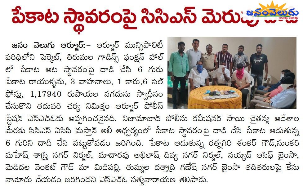 పేకాట స్థావరంపై సిసిఎస్ మెరుపు దాడి. జనం వెలుగు ఆర్మూర్:- ఆర్మూర్ మున్సిపాలిటీ పరిధిలోని పెర్కెట్, తిరుమల గాడిన్స్ ఫంక్షన్ హాల్ లో పేకాట ఆట స్థావరం పై దాడి చేసి 6 గురు పేకాట...